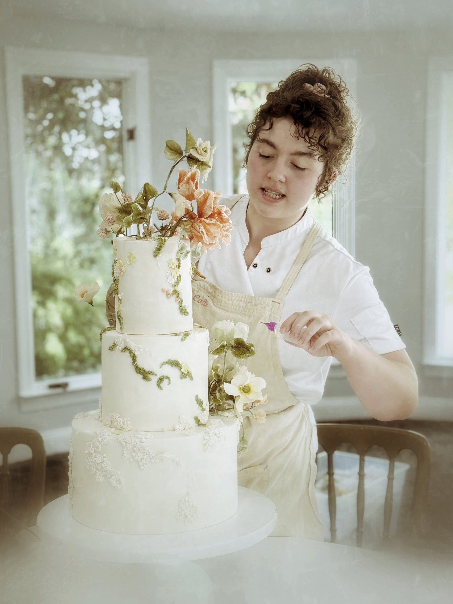 Sally was not involved with her mom and sister's bakery while in high school, but when she took a gum paste flower class with them, she discovered her talent for floral design, and now she is the head wedding cake designer.